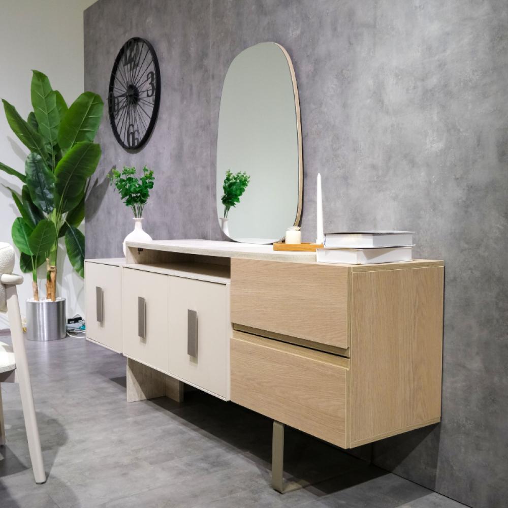 كونسول اورا أنيق مع مرآة تضيف عمقًا ولمسة فاخرة لغرفة الطعام، مثالي لعرض الديكورات وتنظيم المساحة.