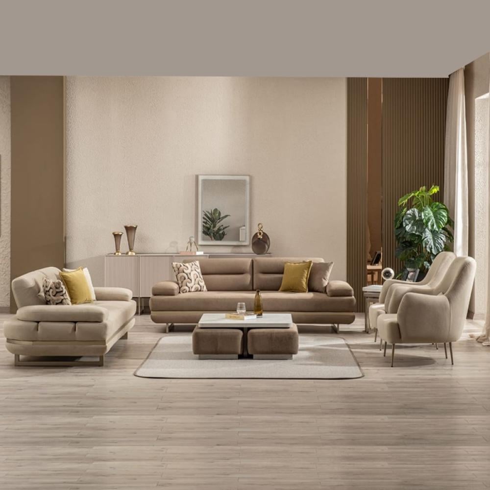 القطع : 1 كنب 3 مقاعد بيج فاتح - 1 كنب 3 مقاعد بنى غامق - 2 كرسي كنب