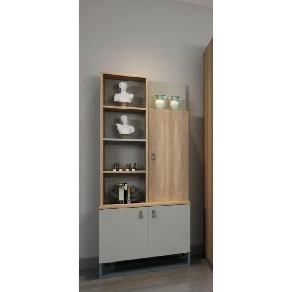 تتميز هذه المكتبة الخشبية بتصميمها الأنيق والعصري، حيث تجمع بين جمال الخشب الطبيعي ووظائف التخزين المتعددة. أرففها الواسعة توفر مساحة كافية لتنظيم كتبك