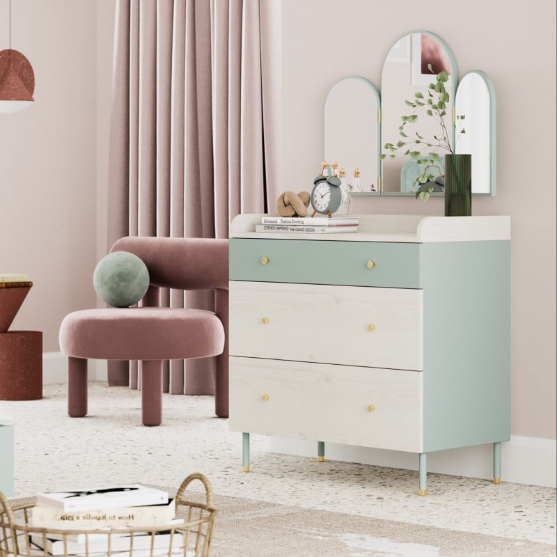 تستلهم التسريحة جمال الطبيعة في تصميمها، حيث تتداخل الألوان الخضراء الكريمة مع لمسة من المعدن البارد، مما يخلق جوًا من الهدوء والانتعاش