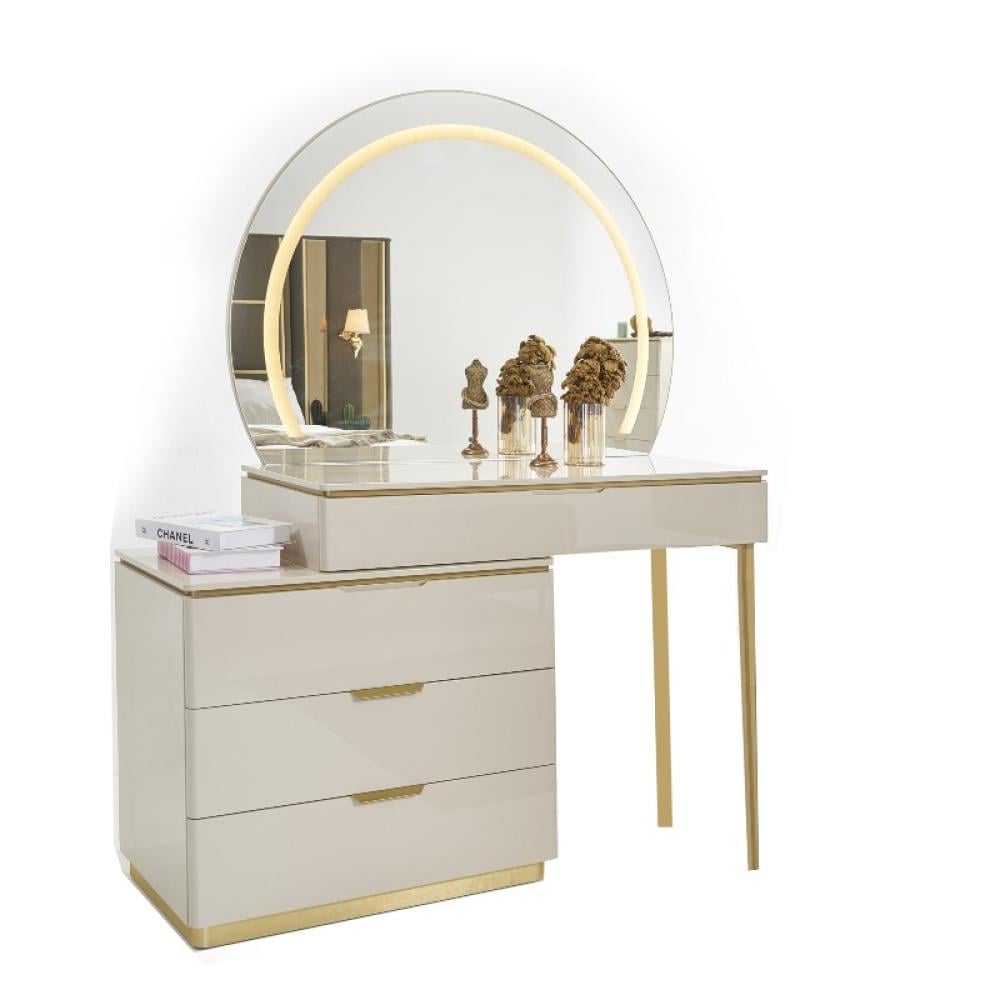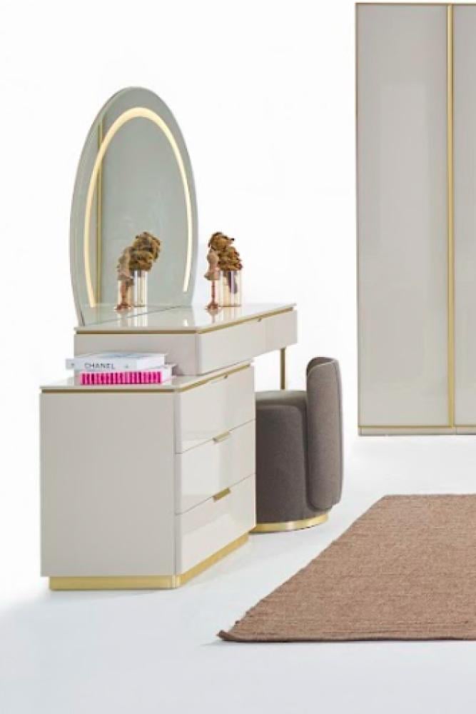 تتميز هذه التسريحة بتصميمها العصري الأنيق. يبرز اللون البيج الدافئ، الذي يضفي شعوراً بالدفء والراحة، في حين أن الأرجل الذهبية المصنوعة من المعدن اللامع تضيف لمسة من البريق