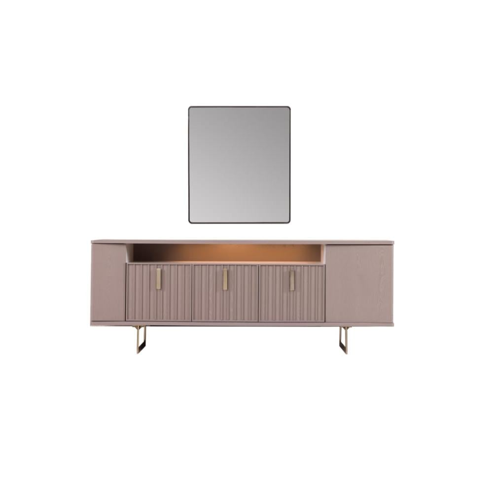 مرآة كبيرة مع كونسول لاتيه عملي، تضيف لمسة راقية وتوفر مساحة مثالية لتخزين الأدوات أو عرض الديكورات.