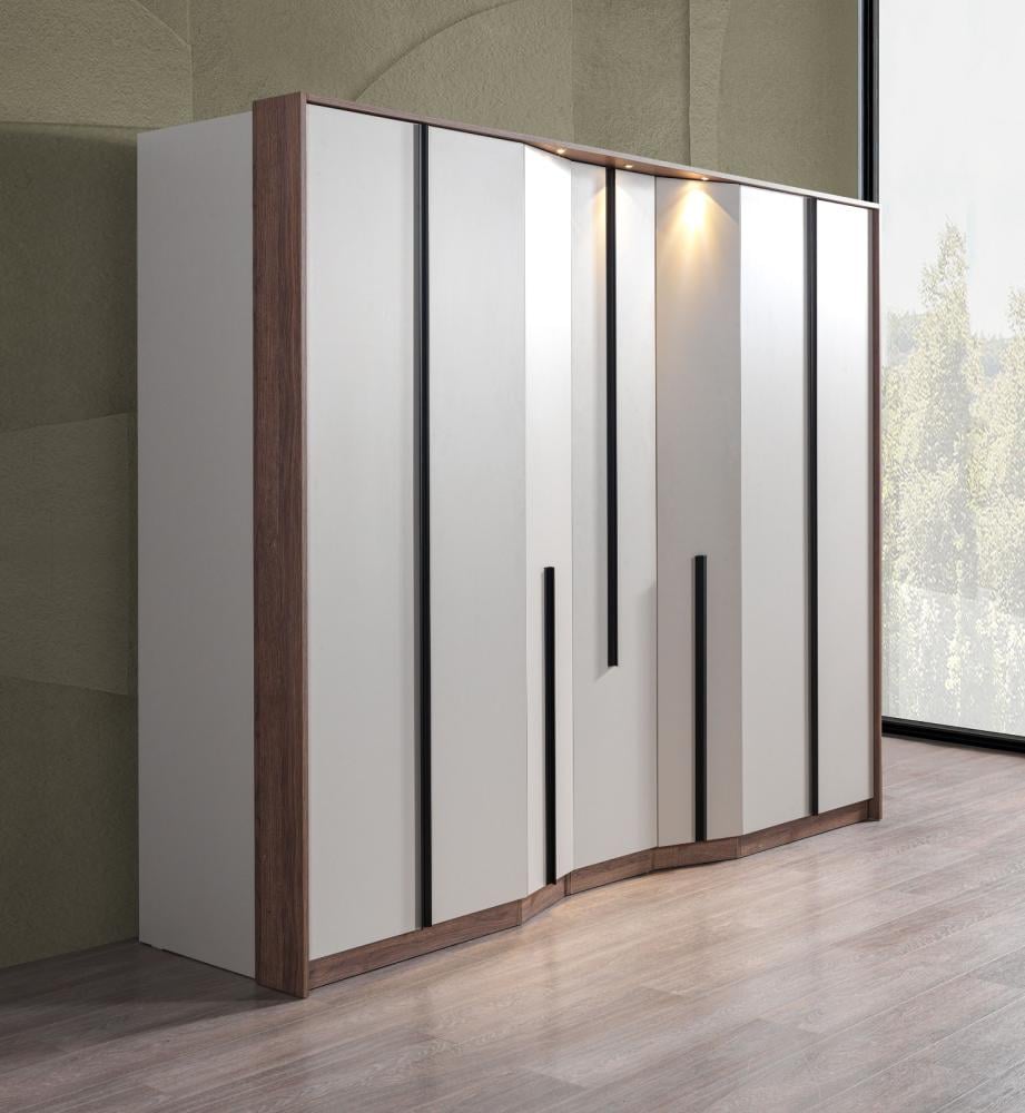 القطع : سرير 180سم بدون تخزين - 2كمودينة - تسريحة مع مرايا طويلة - خزانة أدراج - دولاب 7 أبواب